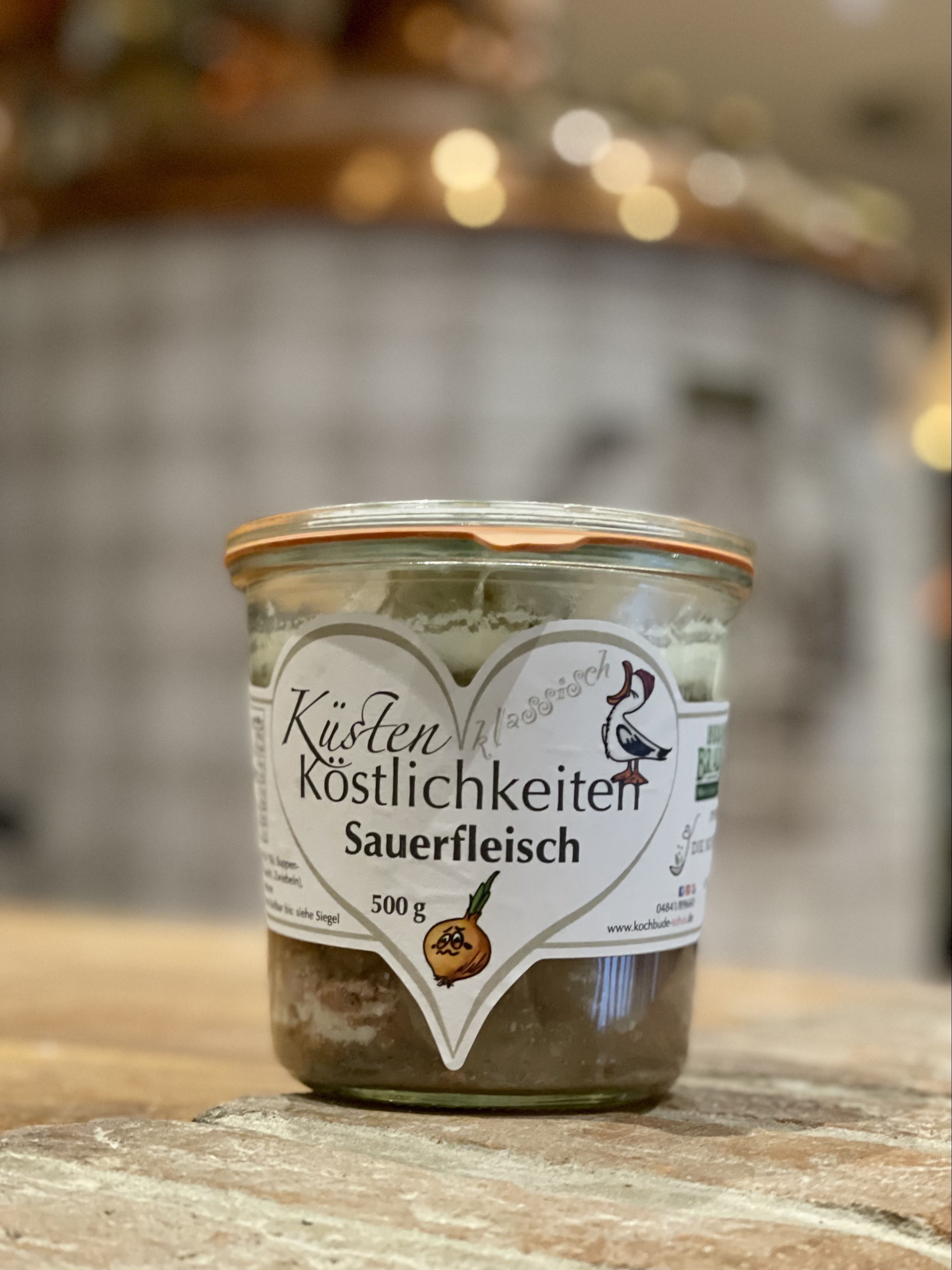 Unser Sauerfleisch wird nach dem Kochen frisch und sicher eingeweckt, sodass diese einige Monate haltbar ist.