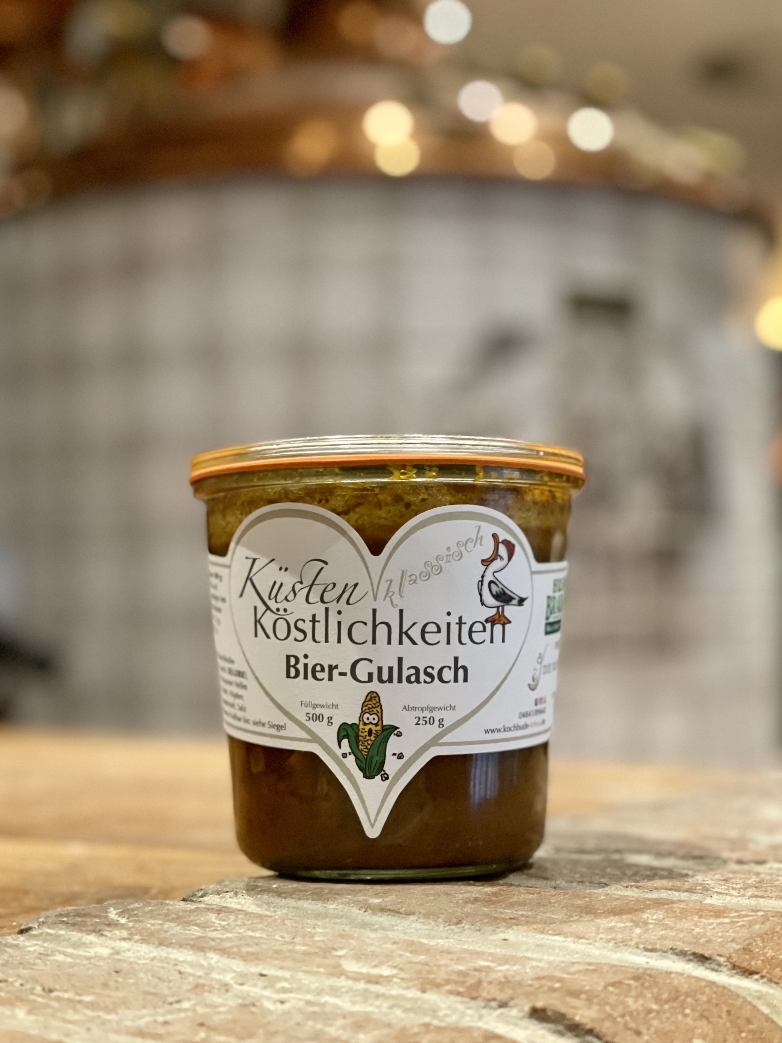 Zutaten: Rindfleisch, Fleischbrühe (Rindfleisch, Karotte, Lauch, SELLERIE) Zwiebeln, Paprika, 5% Husumer Helles Bier (Trinkwasser, WEIZEN, Hefe, GERSTE, Hopfen, 5,3% Alkohol), Mais, Tomatenmark, Salz